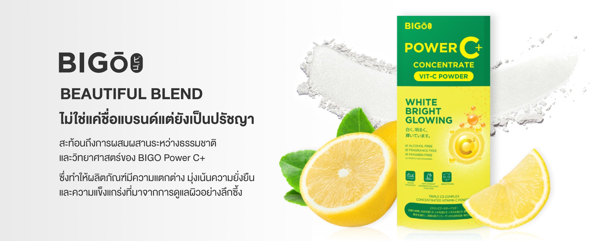 BIGO เราเชื่อว่าความงามไม่ใช่เพียงแค่รูปลักษณ์ภายนอก แต่มาจากการดูแลผิวที่ลึกซึ้งและยั่งยืน ชื่อ BIGO มาจากภาษาญี่ปุ่นว่า "Beautiful Blend" ซึ่งสะท้อนถึงการผสมผสานระหว่างธรรมชาติและนวัตกรรมทางวิทยาศาสตร์ เราใช้ วิตามินซีเข้มข้น ที่คัดสรรอย่างพิถีพิถันจากญี่ปุ่น ร่วมกับเทคโนโลยีการผลิตที่ทันสมัย เพื่อให้ได้ผลลัพธ์ที่ยั่งยืนและมีประสิทธิภาพสูงสุด